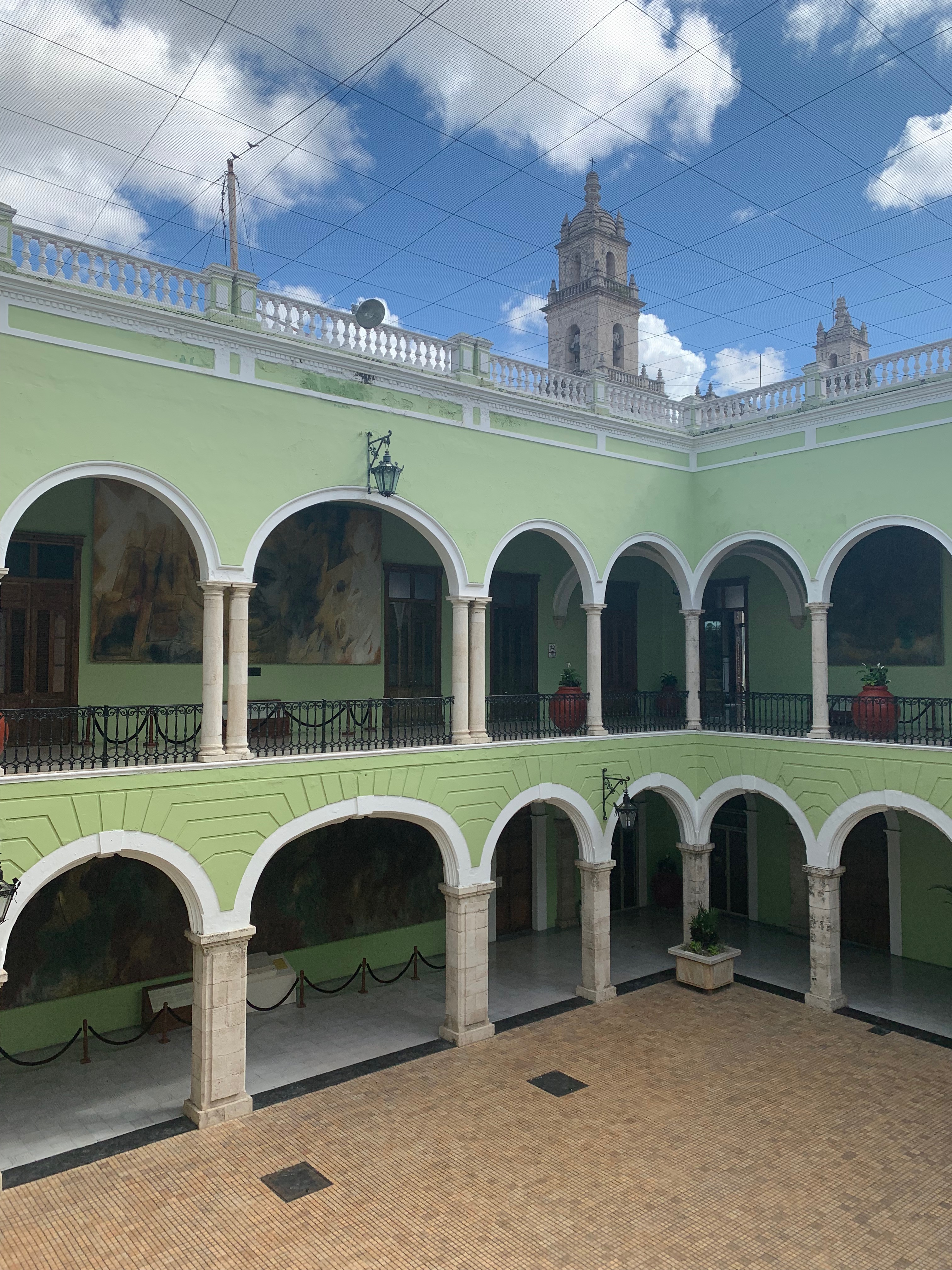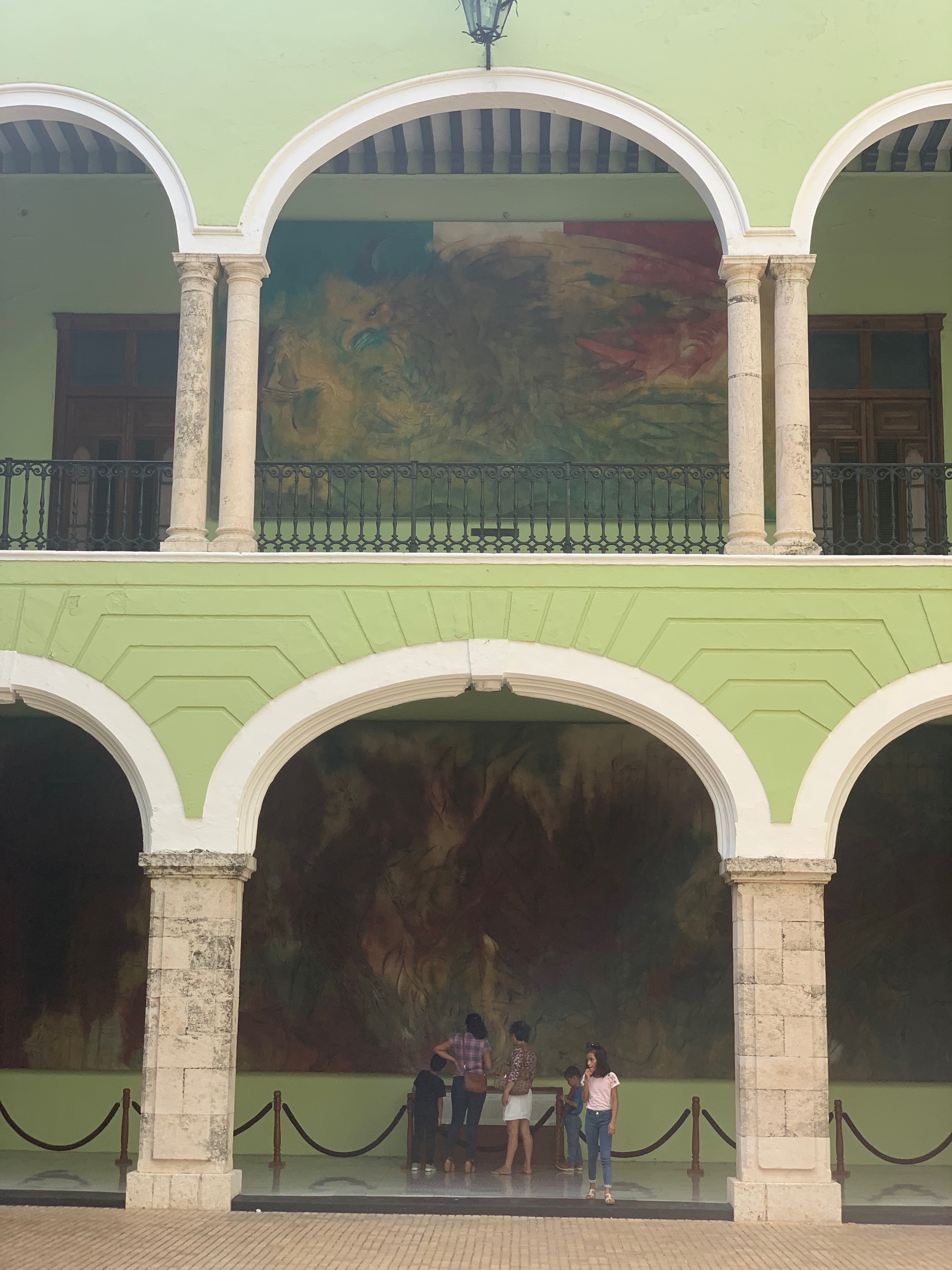 A grand green building of classicist style, stone staircases and a central courtyard. There are 27 murals showcasing the history between the Mayan and Spanish.