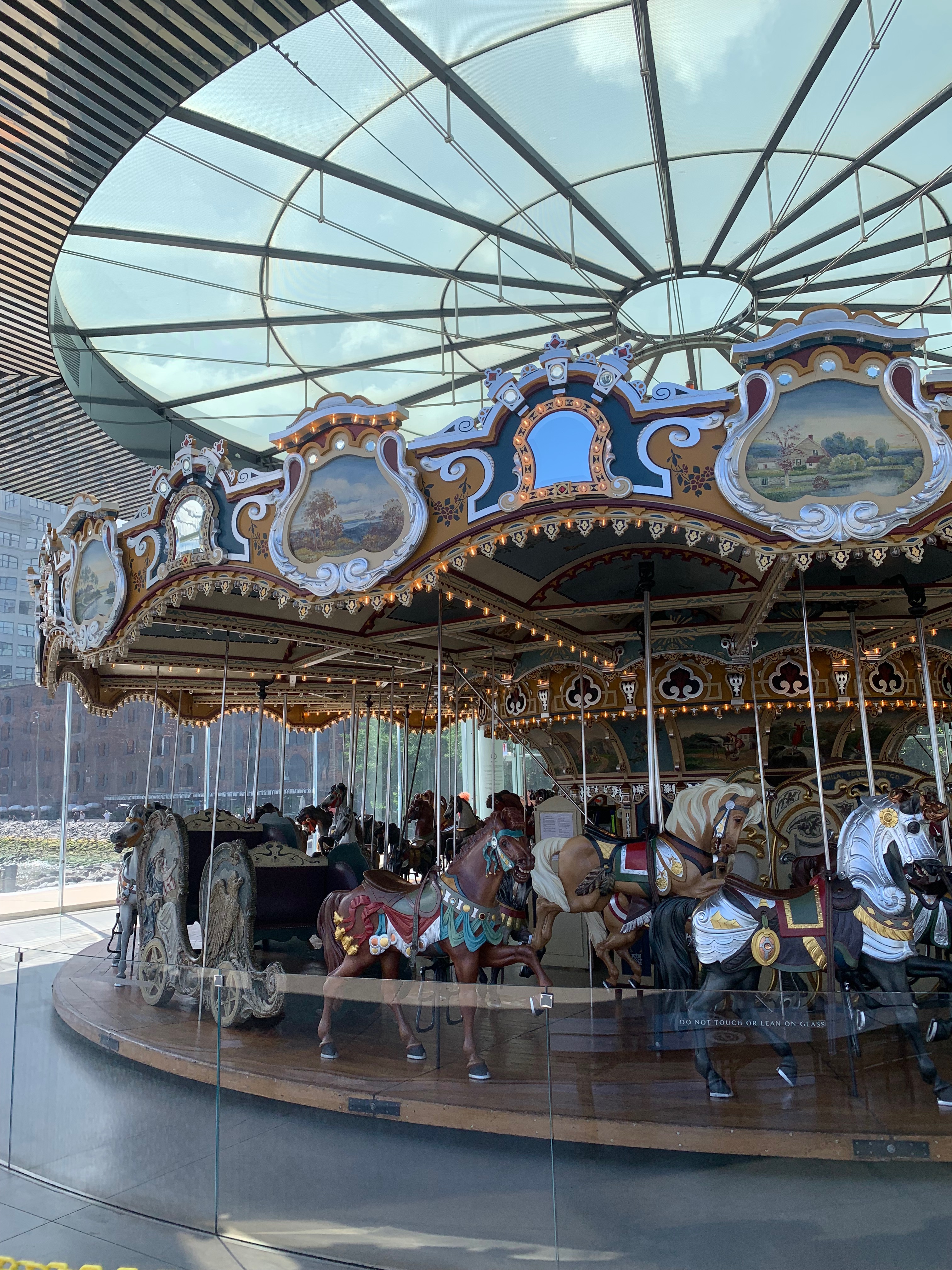 Jane’s Carousel was created in 1922. In 1984, Jane Walentas began restoration basing the original colours on drawings and photographs. It opened to the public on September 16, 2011. It’s housed in a modern glass pavilion, designed by Pritzker Prize-winning architect Jean Nouvel. It gives you a great view of the bridge and pebble beach across the way.